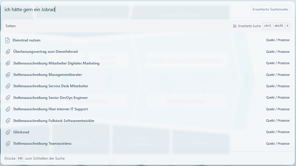 Sucherlebnis auf dem neuesten Stand der Technik: Die neue Suche bringt Q.wiki auf das Niveau moderner Softwaresysteme. Sie orientiert sich an deinem natürlichen Suchverhalten – so, wie du es von anderen Tools, wie Google, Outlook, Social Media, … bereits kennst. Das macht die Arbeit in Q.wiki schneller, intuitiver und effizienter.