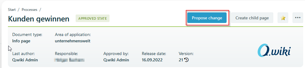 - Propose change creates a change proposal for the approved page.