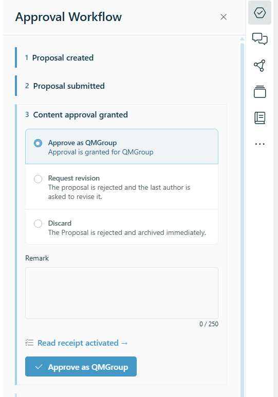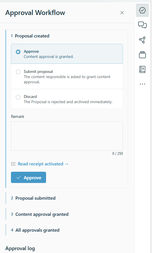 - The approval workflow is located behind the top icon in the right sidebar.