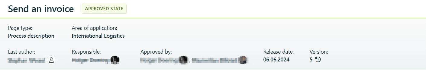 Under “Approved by,” the name of the person who approved the content (usually identical to the person under “Responsible”) is listed first, and to the right of it is the name of the person who formally approved it, who is a member of the QMGroup.