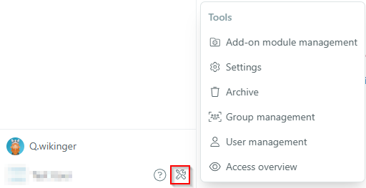 The arrangement of the tools has been updated as of Q.wiki release 6.8. From now on, there are area-specific tools that are located directly in the respective module. Note: Depending on which rights you have in Q.wiki, different tools will be displayed.