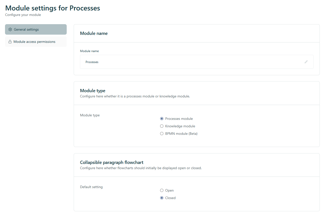 - Module management: You can manage your module and create new configurations via the module management. Typical examples of this are the Audit module or the Internal Projects module.