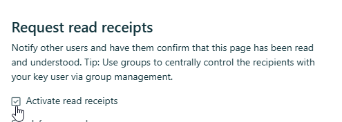 - Enable read confirmation: Edit page → turn on Read confirmation → select target audience.